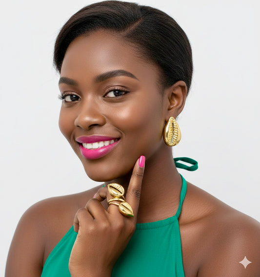 Cowrie Shaped Gold Earrings and Adjustable Ring Set. Material is Stainless Steel and 18...